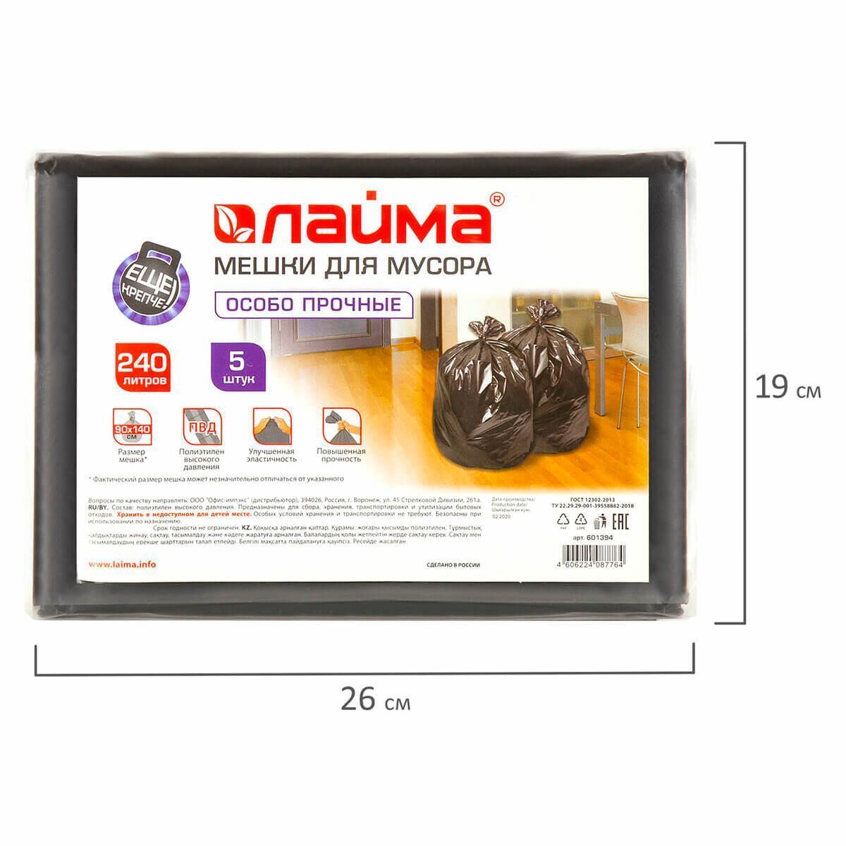 Мешки для мусора 240 л, черные, в пачке 5 шт., ПВД 60 мкм, 1400х900 мм, LAIMA, 601394