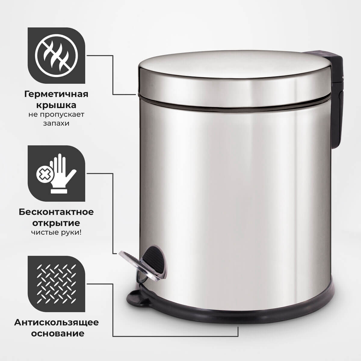 Изготовленное из нержавеющей стали с антикоррозийным покрытием, ведро гарантирует долгий срок службы. Антискользящее основание обеспечивает устойчивость. Рекомендуемый объем мешка - 10 литров. В стальном цвете с зеркальным покрытием, оно гармонично дополнит интерьер любого помещения.